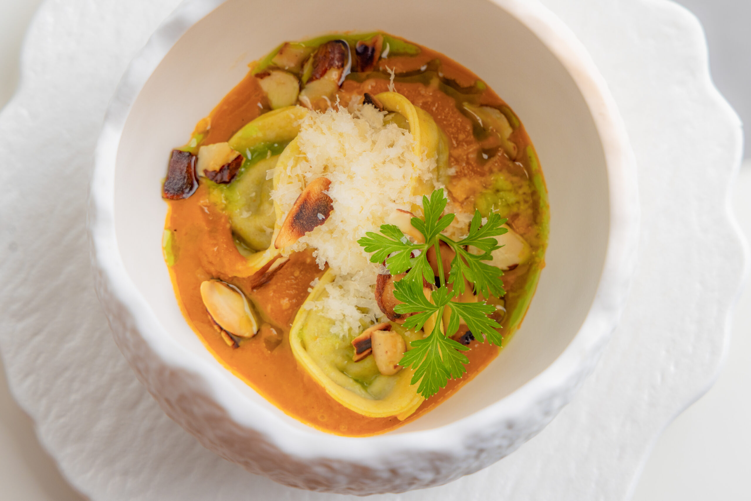 Handmade tortellini stuffed with a seafood blend, finished in a light coconut tomato coulis.